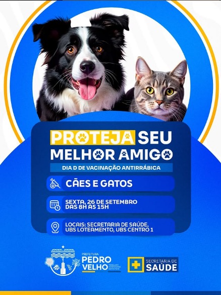 Nesta sexta-feira, 26 de setembro, acontece o Dia D de Vacinação Antirrábica para cães e gatos em Pedro Velho.