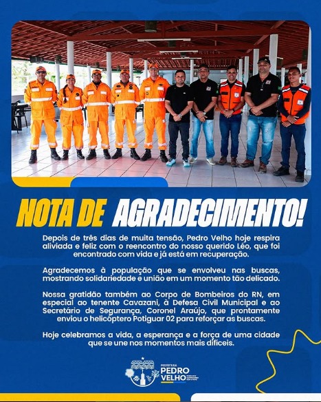 Nosso muito obrigado a todos que se uniram nessa corrente de solidariedade — população, Corpo de Bombeiros do RN (em especial o tenente Cavazani), Defesa Civil Municipal e ao apoio do Secretário de Segurança, Coronel Araújo, que enviou o helicóptero Potiguar 02.